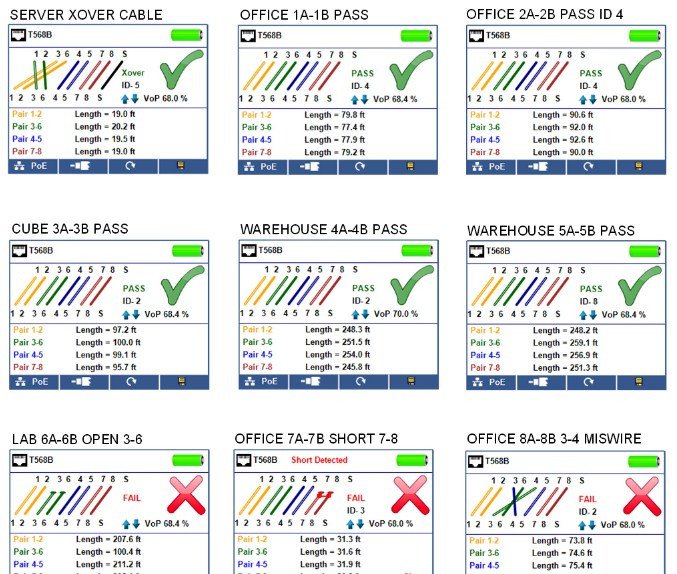 - Tests ethernet cable configuration and verifies connectivity while conducting tests for opens, shorts, miswires, split pairs, and reverses